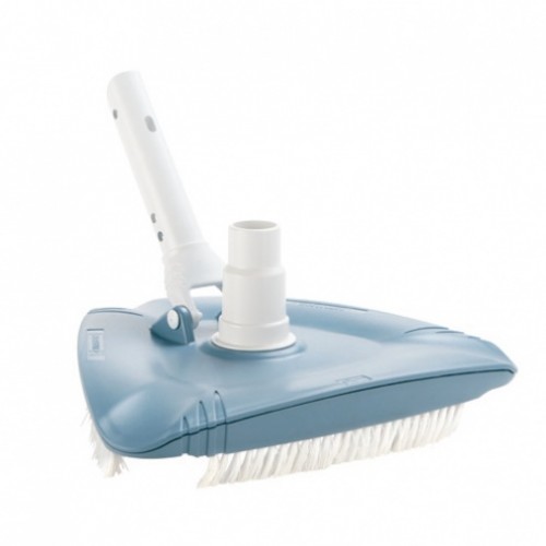 Треугольный пылесос для бассейна из ABS-пластика и щёткой из полипропилена. Эта модель может быть подключена к шлангам диаметром 32 и 38 мм. С креплением при помощи гайки-барашка или зажима.