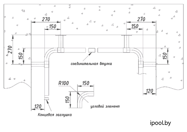 Поручень крепится к борту бассейна при помощи кронштейнов (АТ 11.08).