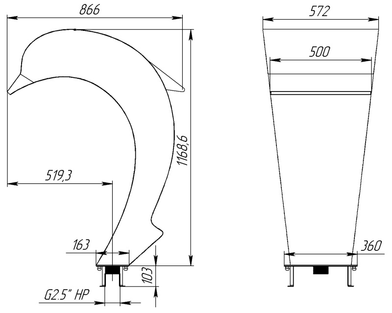Водопад, выполненный из нержавеющей полированной стали, является декоративным элементом. Вода с помощью насоса забирается из бассейна, далее подается по трубам на водопад и через сопла различной формы достигается большой напор струи.