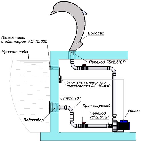 Водопад "Дельфин", выполненный из нержавеющей стали обработанной для создания эффекта "змеиная кожа", является декоративным элементом. Вода с помощью насоса забирается из бассейна, далее подается по трубам на водопад и через сопла различной формы достигается большой напор струи.