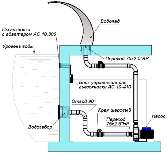 Большой напор струи обеспечивает насос, который нагнетает воду по напорному трубопроводу в форсунку водопада. Из форсунки происходит истекание воды сплошной "зеркальной стеной" в ванну бассейна. Водопад предназначен для установки в бассейнах с бетонной чашей.