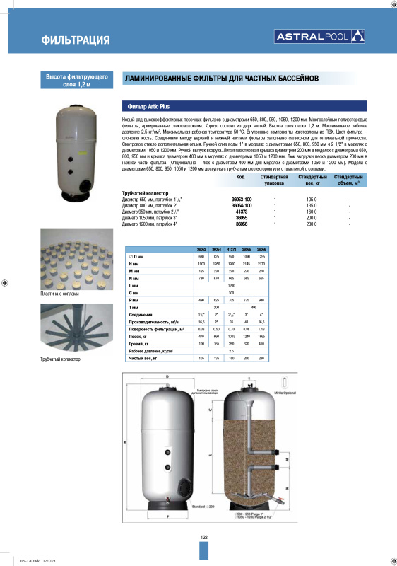 Новый ряд высокоэффективных песочных фильтров с диаметрами 650, 800, 950, 1050, 1200 мм. Многослойные полиэстеровые фильтры, армированные стекловолокном. Корпус состоит из двух частей. Высота слоя песка 1,2 м. Максимальное рабочее давление 2,5 кг/см2. Максимальная рабочая температура 50 °С. Внутренние компоненты изготовлены из ПВХ. Цвет фильтра – слоновая кость. Соединение между верхней и нижней частями фильтра заполнено силиконом для оптимальной прочности. Смотровое стекло дополнительная опция. Ручной слив воды 1” в моделях с диаметрами 650, 800, 950 мм. Ручной выпуск воздуха. Литая пластиковая крышка диаметром 200 мм в моделях с диаметрами 650,800, 950 мм. Люк выгрузки песка диаметром 200 мм в нижней части фильтра.Модели с диаметрами 650, 800, 950, 1050 и 1200 мм доступны с трубчатым коллектором или с пластиной с соплами.