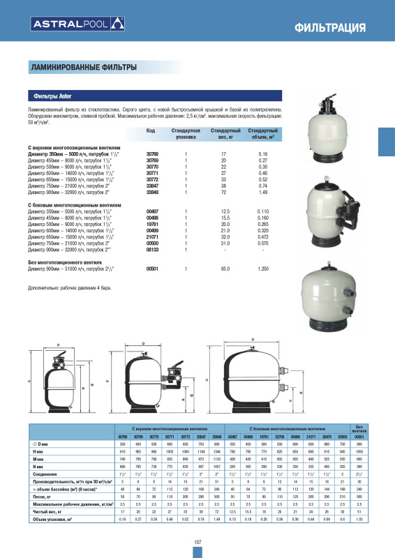 Фильтровальная емкость Aster 750mm,с верхн.многопозиц.вентилем