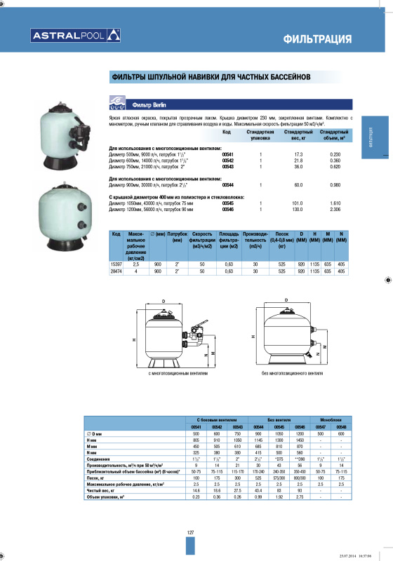 Предназначен для очистки воды от механических загрязнений. Фильтрующим материалом является кварцевый песок. Скорость фильтрации до 50 м3/ч/м2. Материал корпуса Стекловолокно (Шпульная навивка). Крышка закреплена винтами. В комплекте с манометром и ручным клапаном для стравливания воздуха и воды. Диаметр фильтра 1200 мм, площадь фильтрации 1,12 м2. Рекомендуется для бассейнов объемом 280 м3.