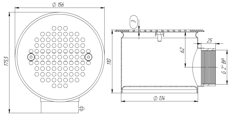 Присоединение - внутренняя резьба 2". Крышка за счет увеличенного размера скрывает примыкание и возможные дефекты подрезки плитки (мозаики).