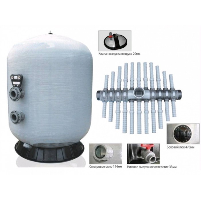 Материал корпуса фильтра изготовлен из стекловолокна и полиэстера. Корпус фильтра устойчив к воздействию ультрафиолетовых лучей, что позволяет работать фильтру под прямым воздействием солнечного света. Фильтр оборудован автоматическим клапаном для выпуска воздуха. В качестве фильтрующего элемента применяется кварцевый песок.