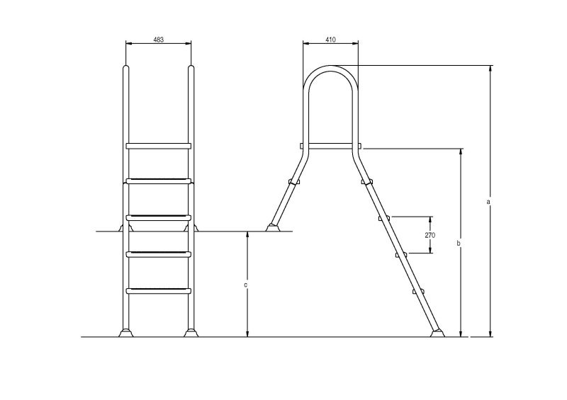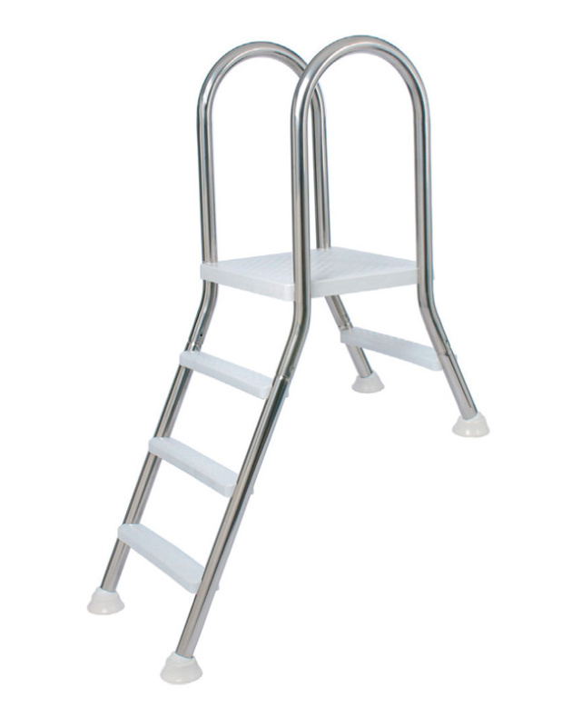 Лестница двухсторонняя 1+3 ст. ESC PNS. Платформа и ступени из пластика. Одна ступенька с одной стороны и три с другой. Лестница устанавливается над бортиком. Изделие предназначено для бассейнов установленных на поверхности. С поручнями из нержавеющей стали марки AISI-304. Одна часть лестницы опирается на дно бассейна, другая на поверхность возле бортика. Ступени и платформа крепятся к поручням болтами из нержавеющей стали.