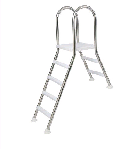 Лестница двухсторонняя 2+4 ст. ESC PNS. Платформа и ступени из пластика. Две ступеньки с одной стороны и четыре с другой. Лестница устанавливается над бортиком. Изделие предназначено для бассейнов установленных на поверхности. Одна часть лестницы опирается на дно бассейна, другая на поверхность возле бортика. Ступени и платформа крепятся к поручням болтами из нержавеющей стали.