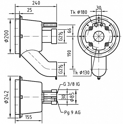 встраиваемого корпуса из оловянно-цинковой бронзы в комплекте с 1 защитной трубой PG9 для пневматического шланга, 1 трубы Rg 13,5 для подачи воздуха, напорная сторона – внутренняя резьба G 2 1/2, всасывающая сторона – внутренняя резьба G 2 1/2.