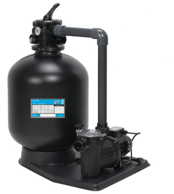Фильтровальная установка оснащена: платформой, песочным фильтром, насосом производительностью 12 м3/час, 6-ти позиционным клапаном, манометром и комплектом фитинга для соединения.