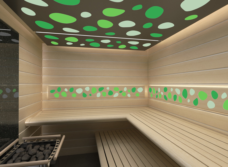 Четыре модели потолка и спинки на выбор, свет из которых проходит и рассеивается, придадут красивые и красочные оттенки в сауне.