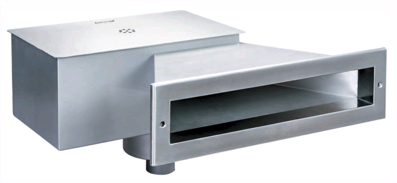 Скиммер выполнен в совершенно новом дизайне от компании Hugo Lahme с широкой всасывающей горловиной шириной 500 мм и высотой 72 мм. Скиммер предназначен для бетонных бассейнов с отделкой из плитки или мозаики, для пленочных бассейнов имеется в продаже фланец с уплотнением. Пропускная способность скиммера 10 куб.м/ч. К данной модели скиммера доступны два варианта регулятора уровня воды: механический и электрический.