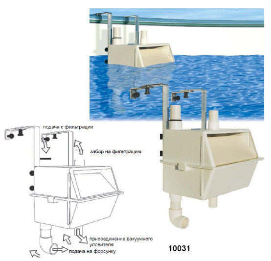 Скиммер навешивается на борт, при этом водозаборное окно должно находиться на уровне зеркала воды.