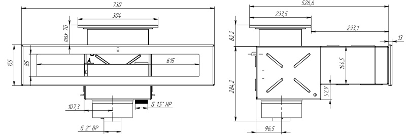 Монтируется в стену. Присоединение к фильтру - внутренняя резьба 2’’, к аварийному переливу - наружная резьба 1,5".