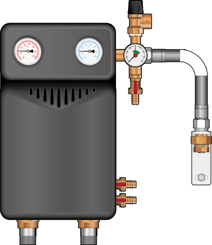Комплект поставки насосной группы: вся необходимая запорная арматура в соответствии с украинскими нормами проектирования систем теплоснабжения,контактные термометры в подающей и обратной линиях,встроенный обратный клапан в запорном узле обратной линии,циркуляционный насос,теплообменник,2 шаровых крана слива/наполнения,группа безопасности (6 бар) с манометром, узел подключения расширительного бака (MAGвентиль,
