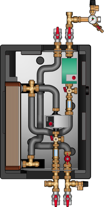 Насосная группа с пластинчатым теплообменником, который делит гелиоконтур на первичный контур - с антифризом, и вторичный контур - с водой.