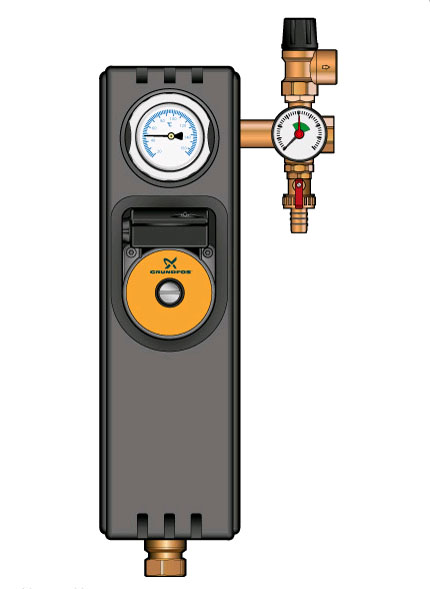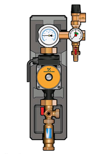 В комплект группы (подающая линия) включены: насос (DN 25, 180 мм) с двухметровым кабелем. Один трехходовой шаровой кран со встроенным металлическим обратным клапаном и контактным термометром (20–150 °С), группа безопасности 6 бар с манометром, 2 крана наполнения/промыва/слива со штуцером и заглушкой, расходомер. В комплект поставки входят: блочная, EPP-термоизоляция, комплект для монтажа группы на стене.